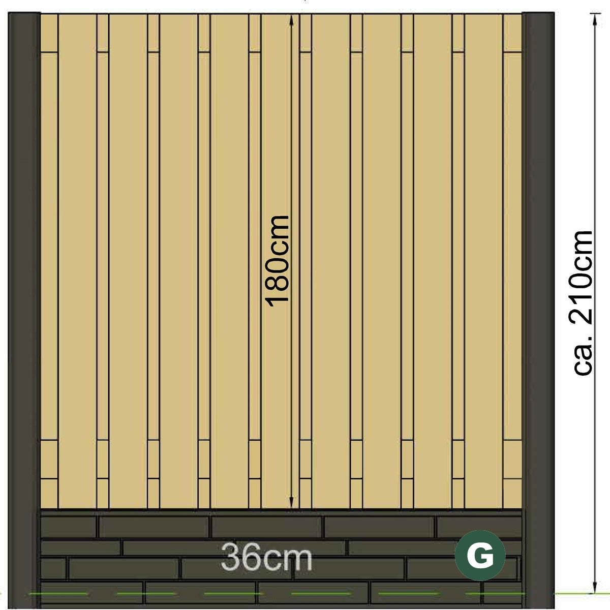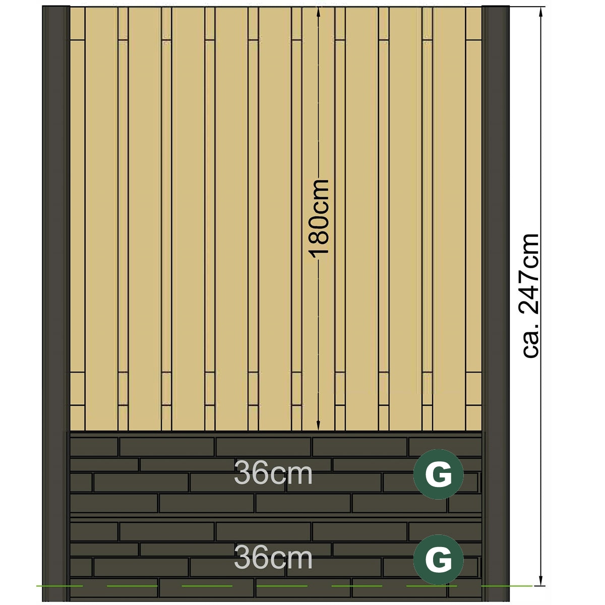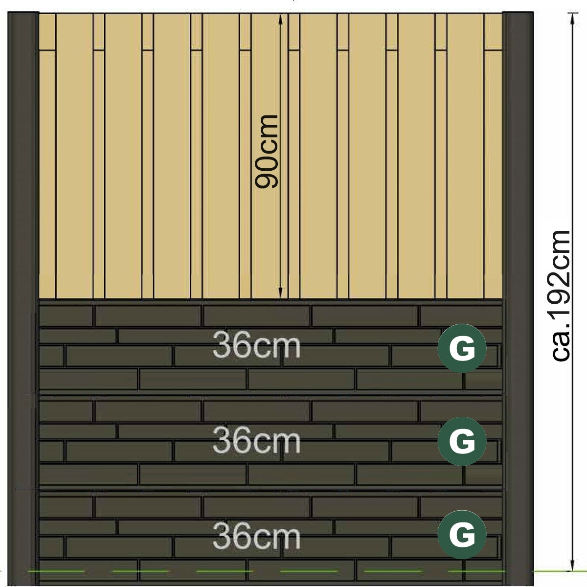 A wooden fence panel in a size of 180 x 180cm combined with a pair of "Rock Face G" concrete gravel boards in heights of 36 cm each. These stacked make up the full height of this fence post size. Finish the Timber panel off in style with a matching timber panel capping. Concrete post caps can also be added.