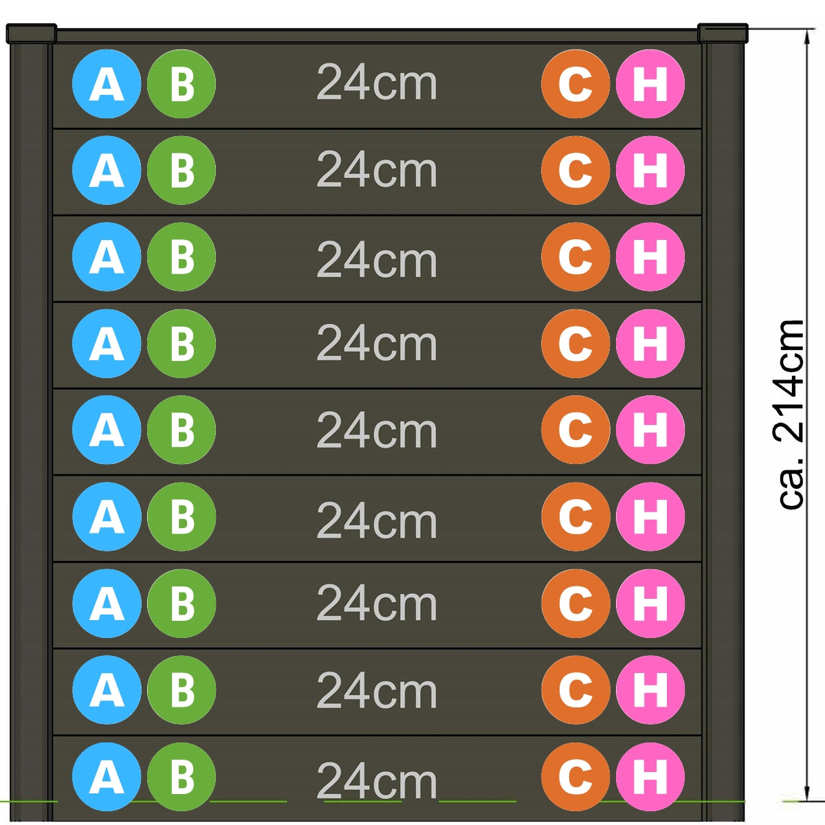 Nine Concrete panels can make up the full height of this fence post from a selection of letter ranges, using "A,B,C,H" depending on the desired width of each section these concrete panels are smooth on both sides and have a height of 24cm.