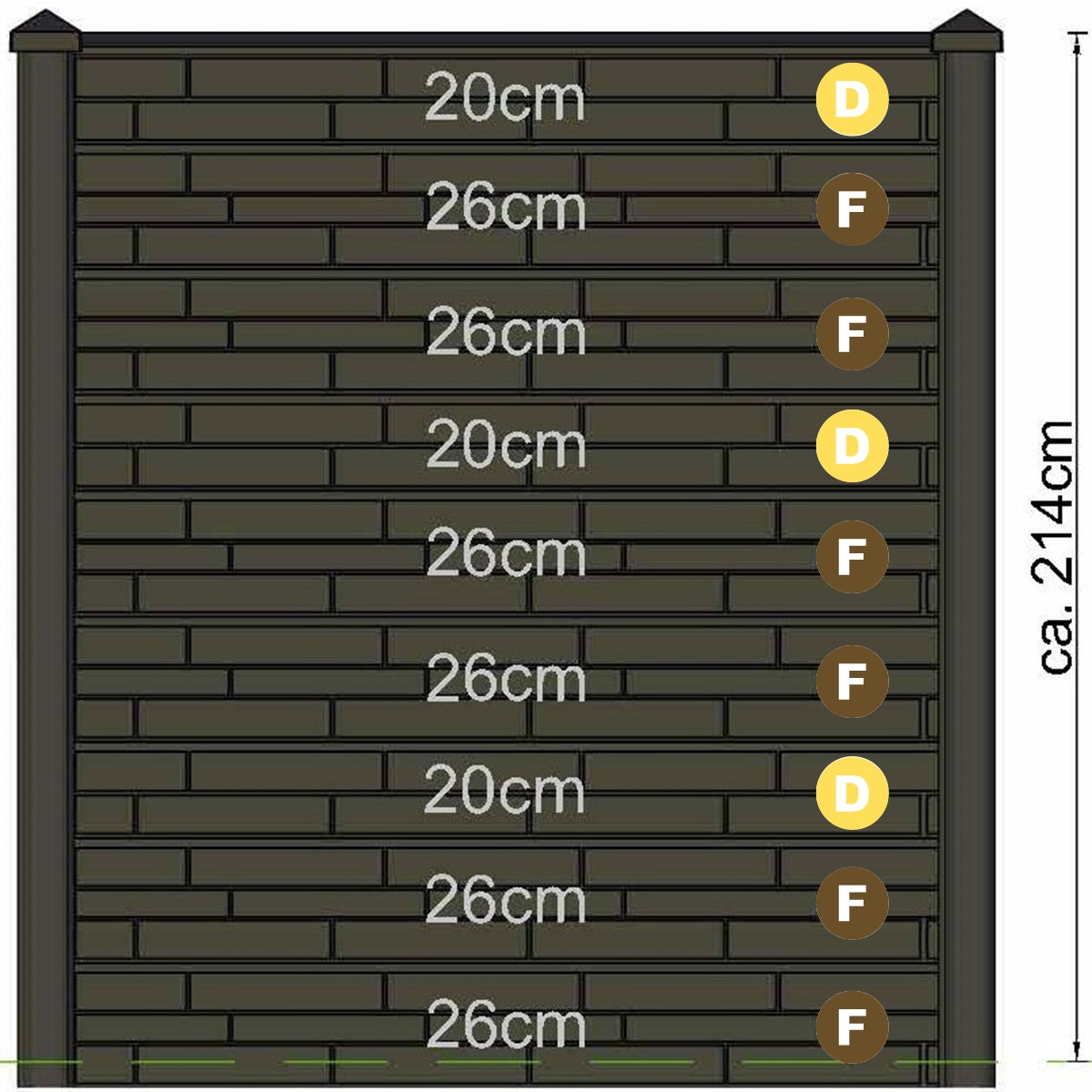 Nine concrete panels make up the full height of this partition using decorative boards "D" and "F". The boards in this range are 184cm wide. The fence posts and panels can be finished with stylish caps.